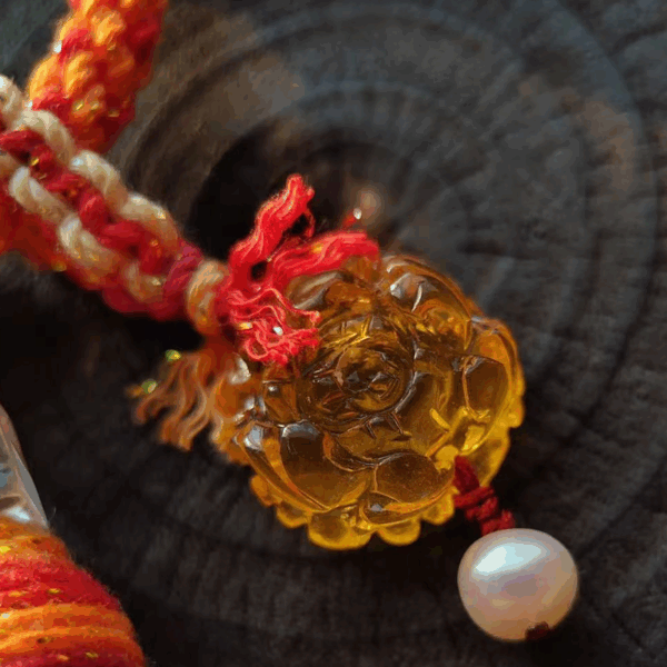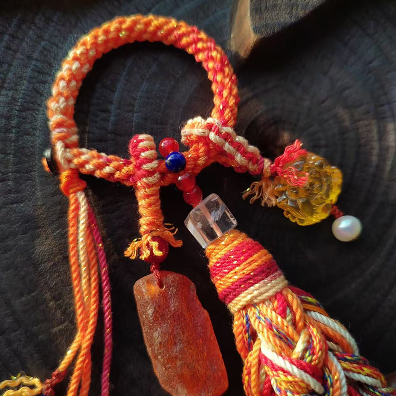 Crafted from raw beeswax amber, clear quartz, Zijin sand, and red agate, every element is woven by hand — a fiery yet grounded charm born of earth and flame.