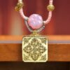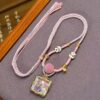 Handwoven pink cord, natural rose quartz, protective evil eye beads, and the mystical nine-tailed fox pendant.
