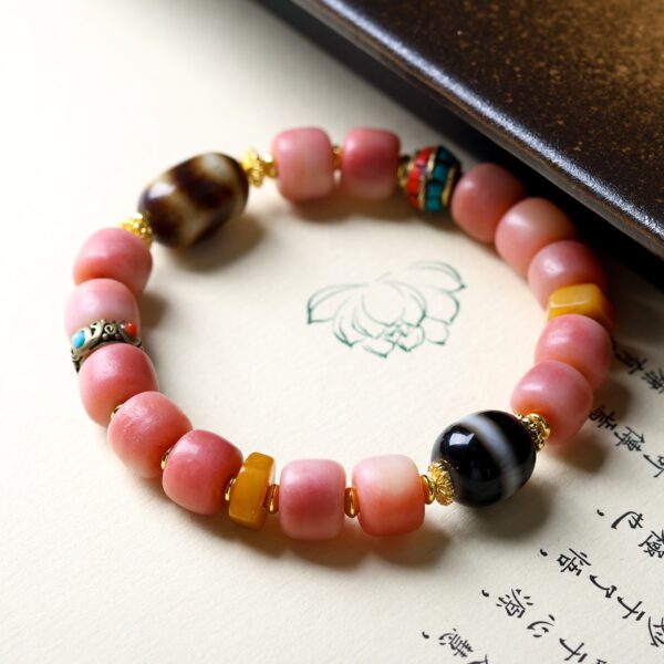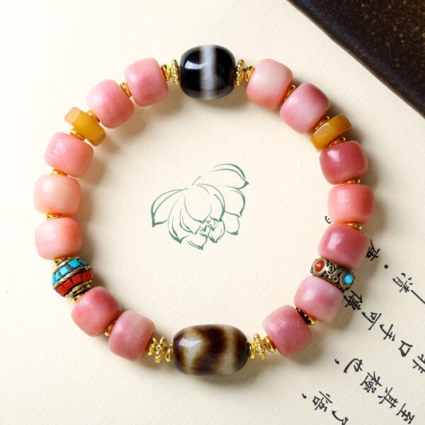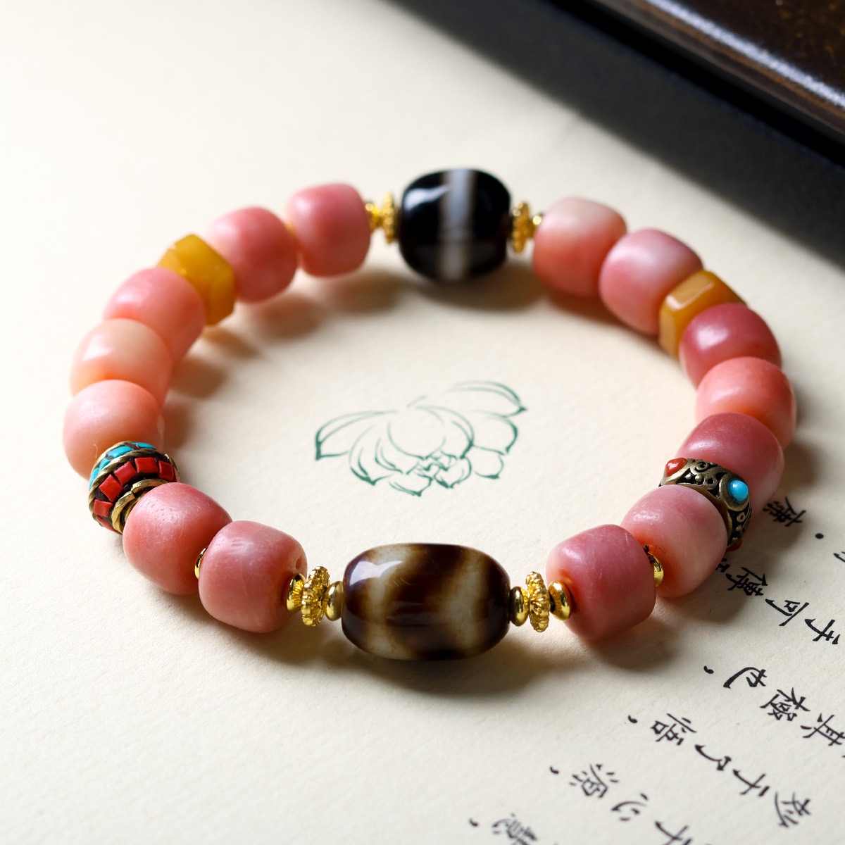 ✨ Tibetan Protection · Carved Bone Dzi Good Luck BraceletHand-carved bone barrel beads in soft pink tones, spinning the energy of good fortune.