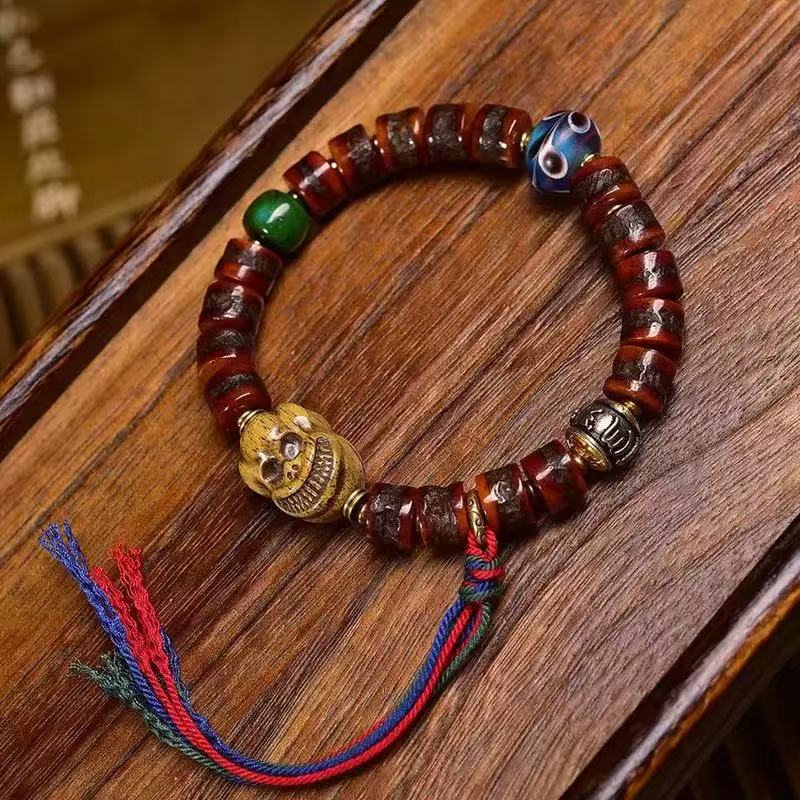 🔮Hand-carved yak bone barrel beads, vintage amber tones, Tibetan dzi beads, and totem skull charm.