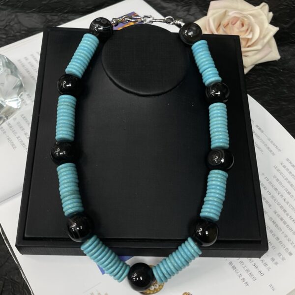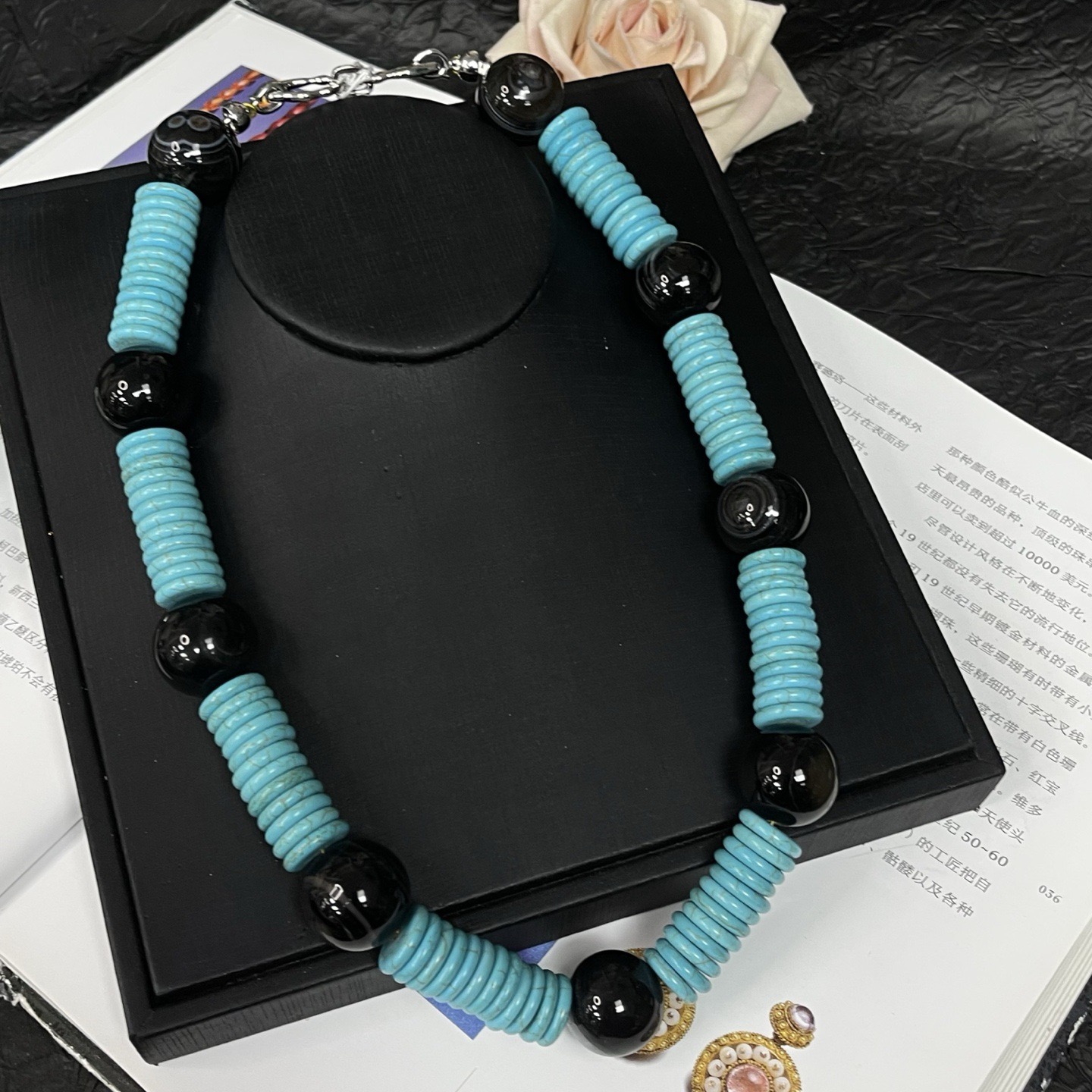 A bold fusion of deep black agate and blue gemstone discs, blending simplicity with calm elegance. Handcrafted with modern artistry and vintage charm, this piece highlights your unique aura and confident presence.