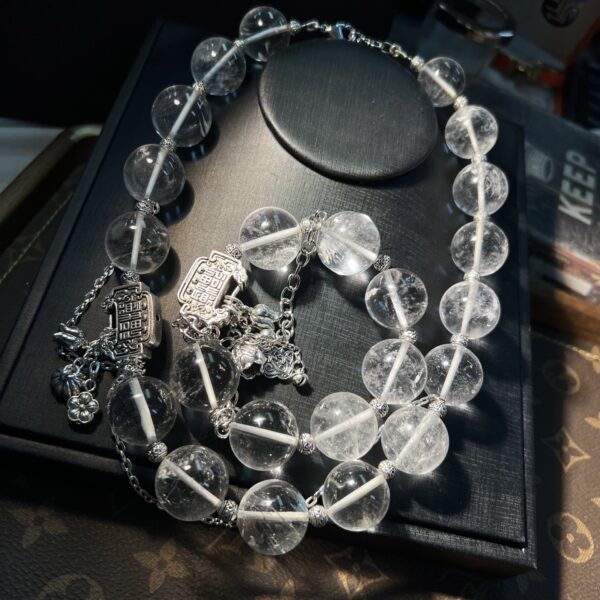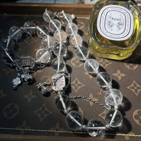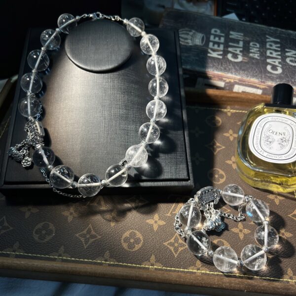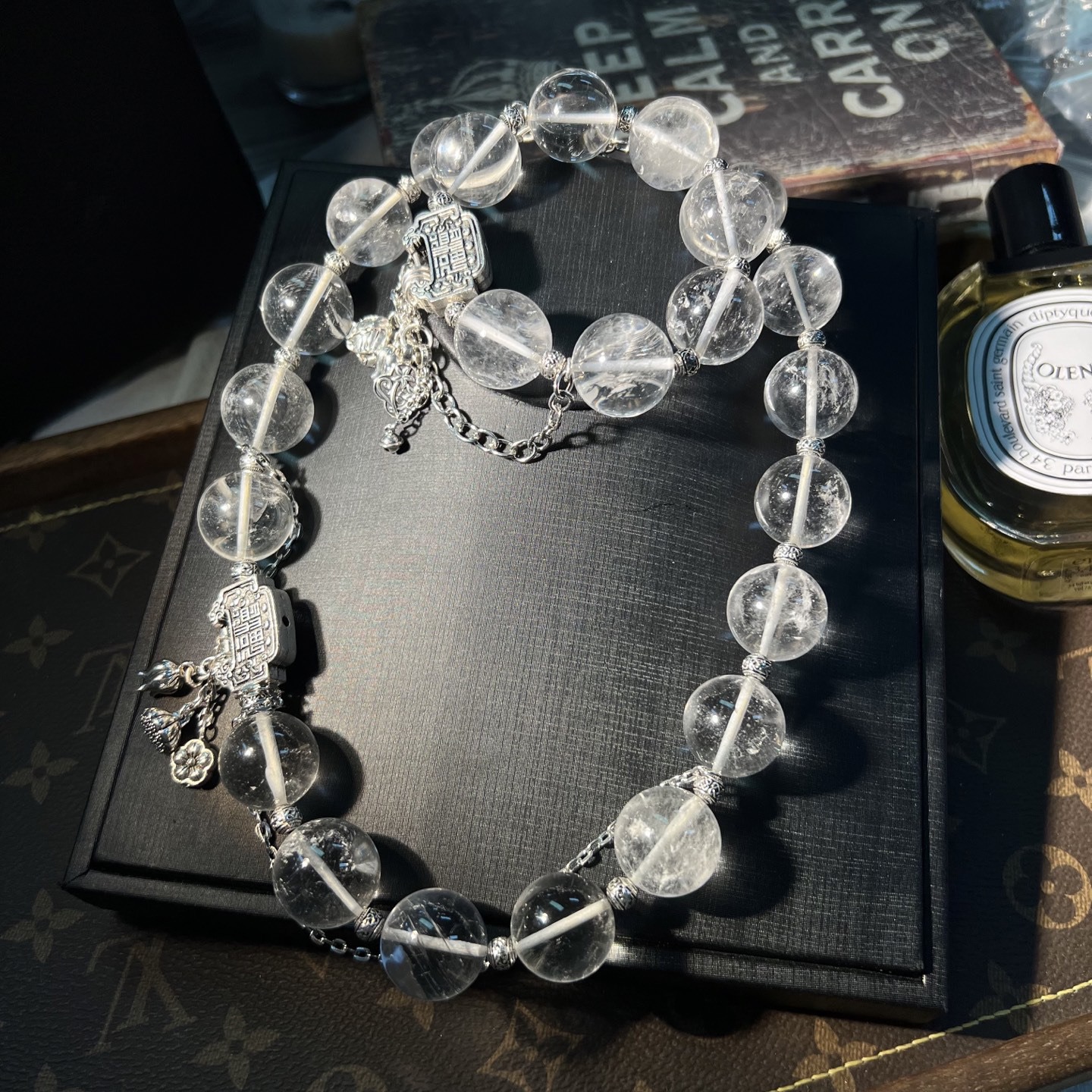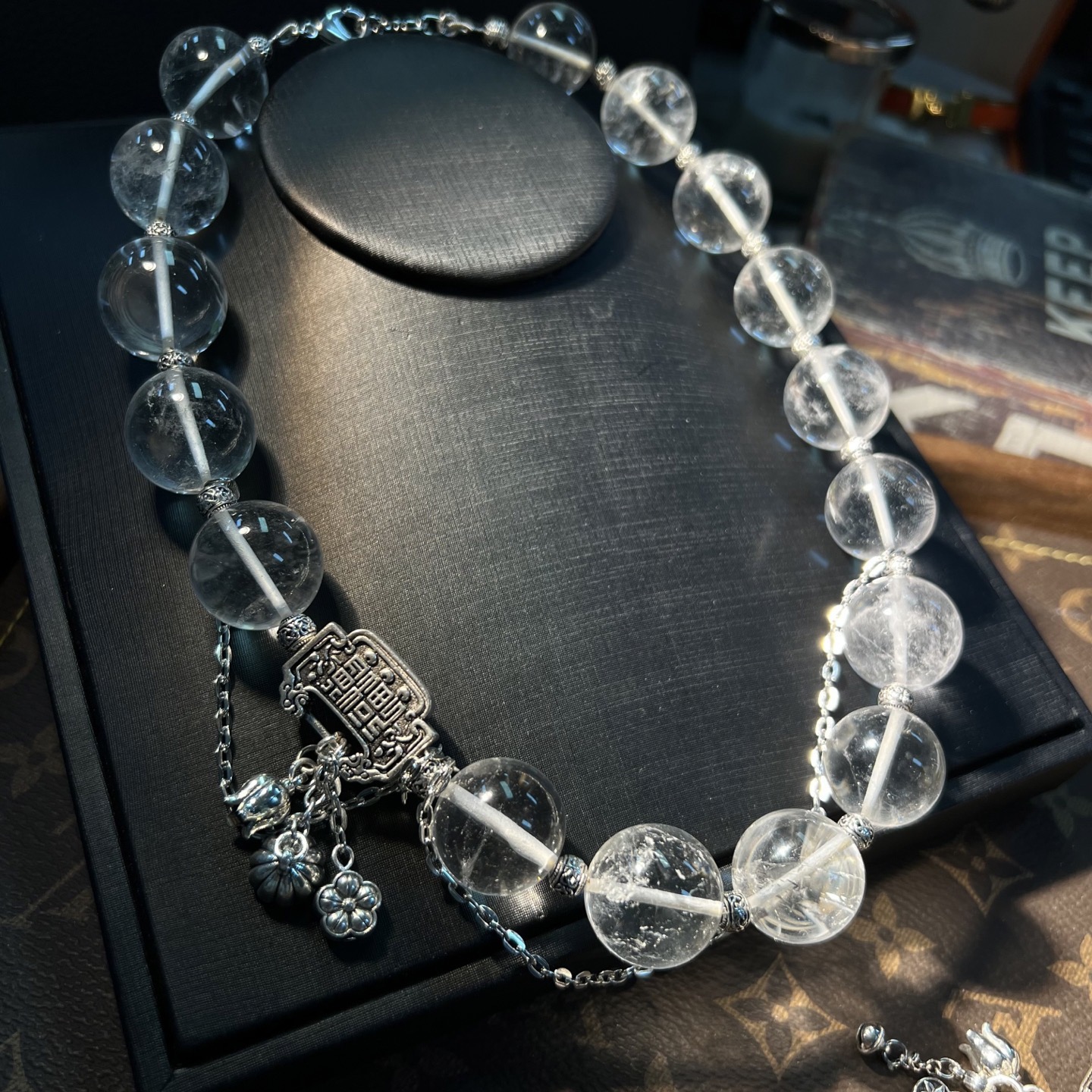 Carefully selected for its pure clarity, each large clear quartz bead is hand-strung with silver details and intricate accents, showcasing an elegant touch of artistic luxury. The crystal’s energy flows gracefully around the neck, purifying the mind, balancing emotions, and adding a sense of clarity and serenity to your daily style.